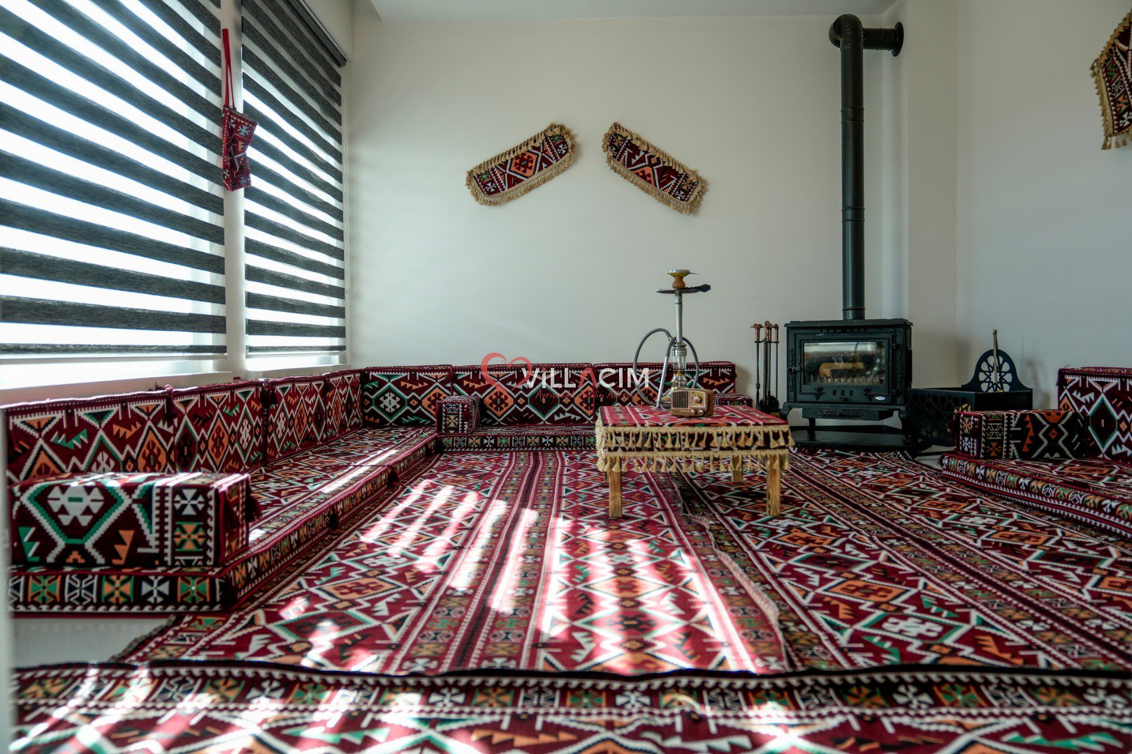 Barbekü alanı, camlı döküm şömine sobası, nostaljik radyo