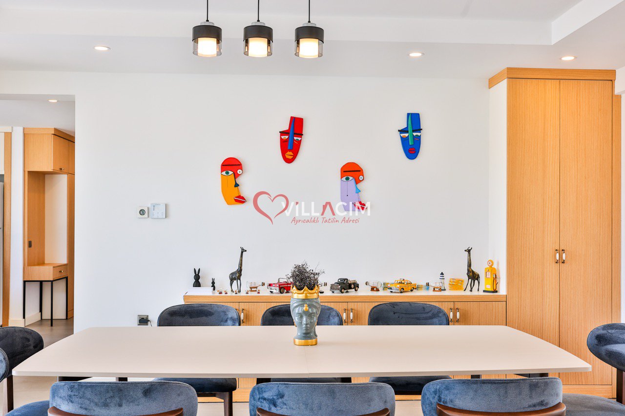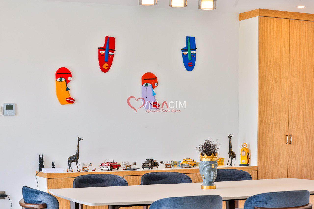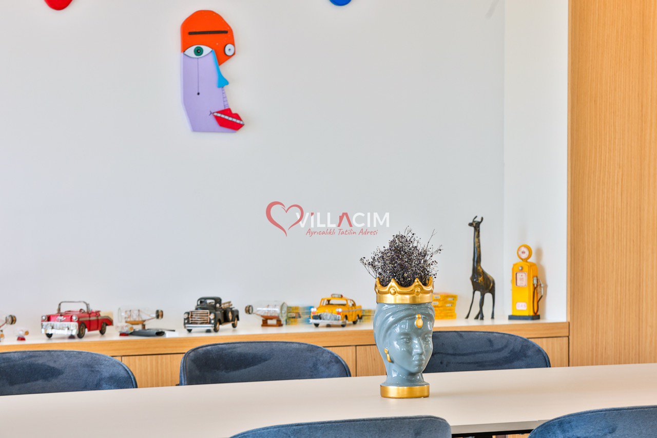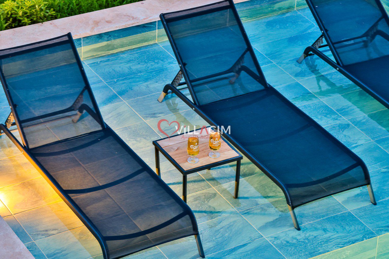 Bahçesinde yer alan zarif heykeller ve özenle düzenlenmiş oturma alanları, villayı adeta bir açık hava sanat galerisine dönüştürür. Geniş bahçe mobilyaları, gün batımını izlerken ya da akşam serinliğinde sevdiklerinizle sohbet ederken mükemmel bir atmosfer sunar.
