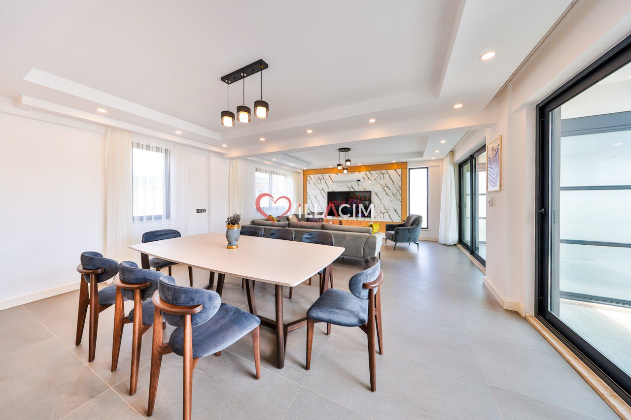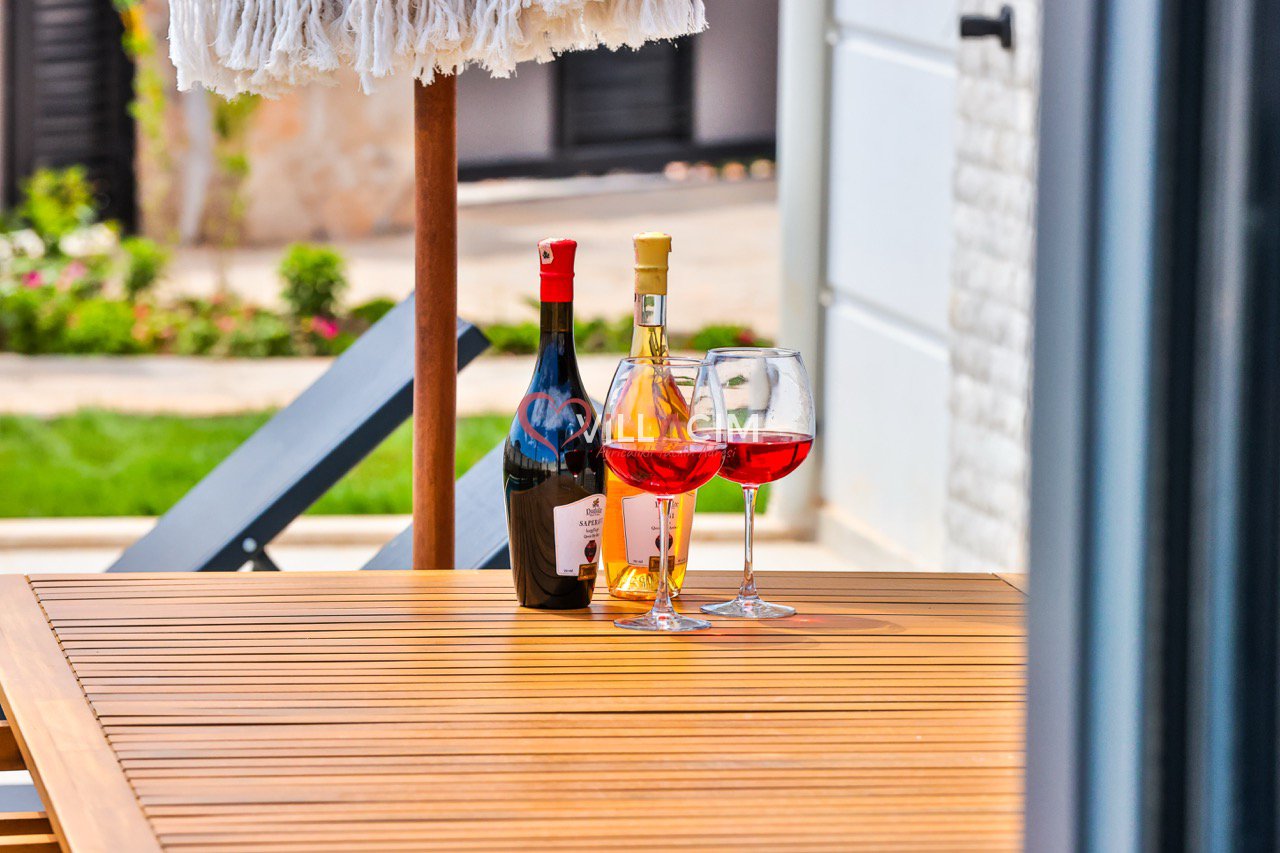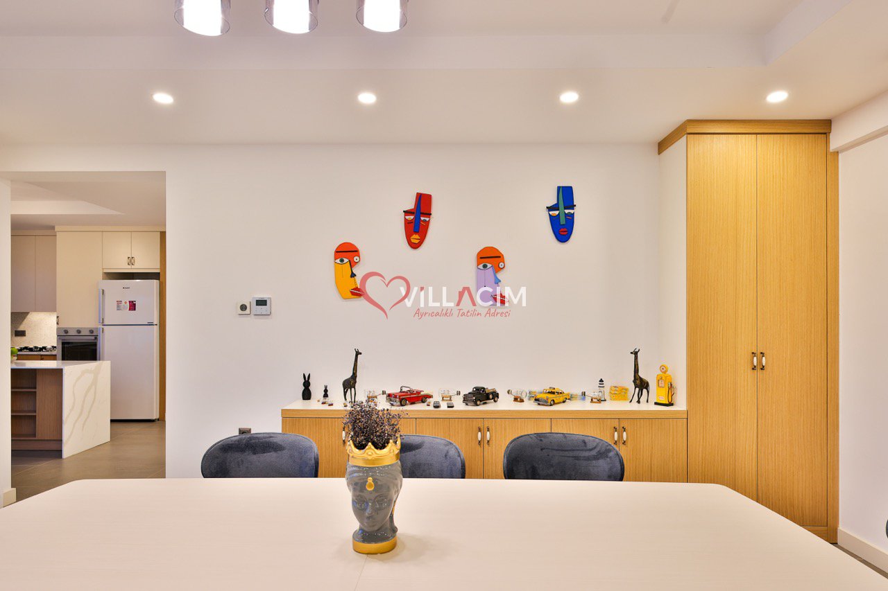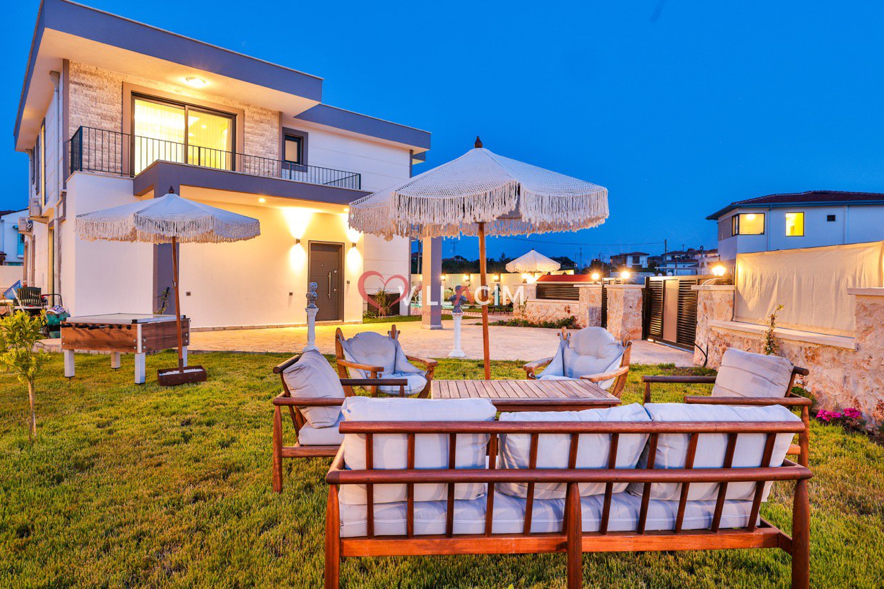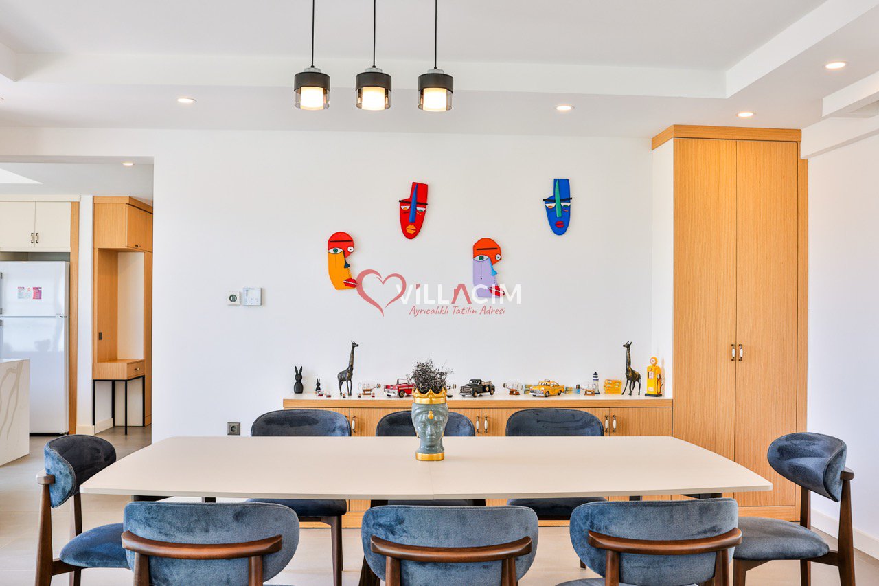 Bahçesinde yer alan zarif heykeller ve özenle düzenlenmiş oturma alanları, villayı adeta bir açık hava sanat galerisine dönüştürür. Geniş bahçe mobilyaları, gün batımını izlerken ya da akşam serinliğinde sevdiklerinizle sohbet ederken mükemmel bir atmosfer sunar.