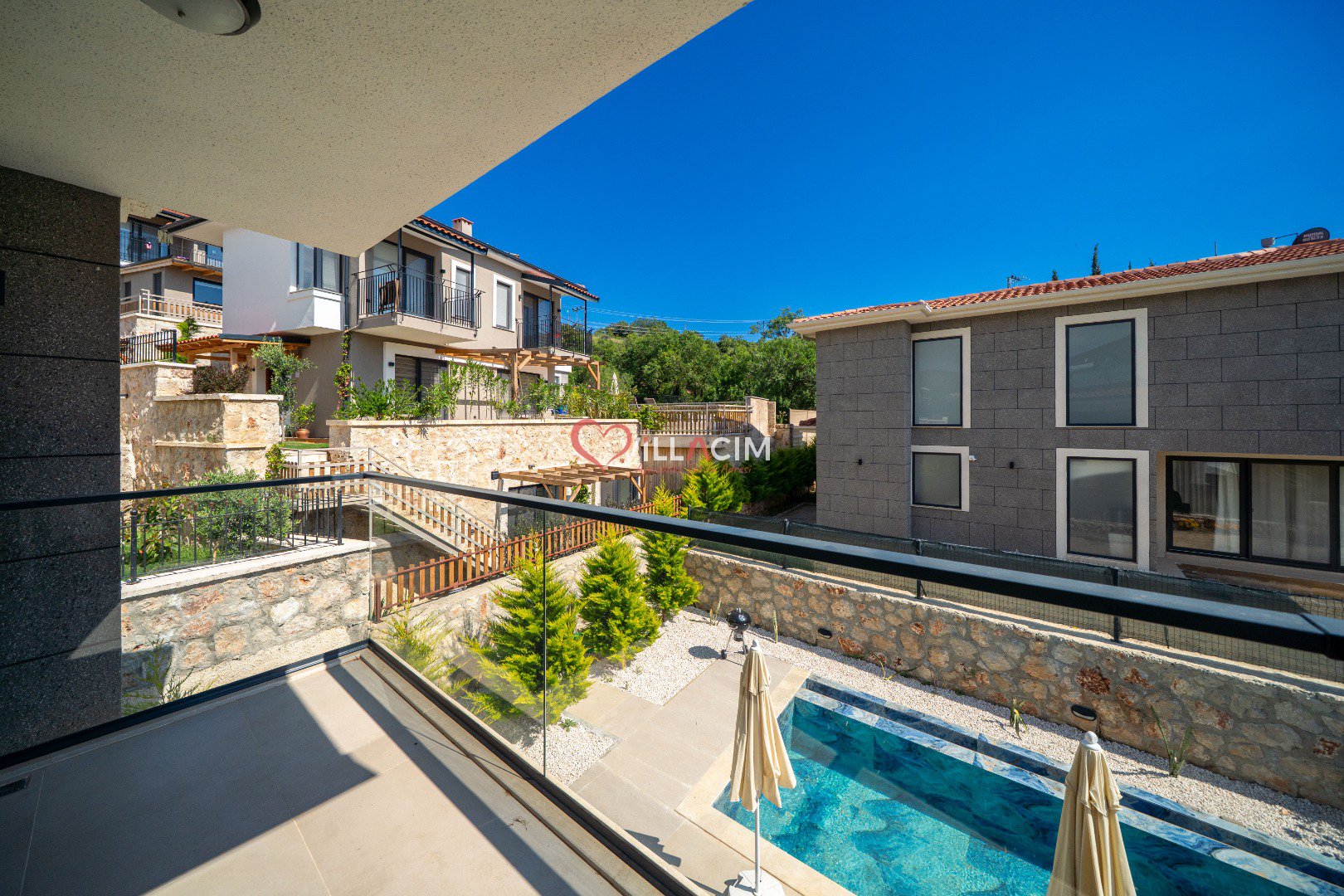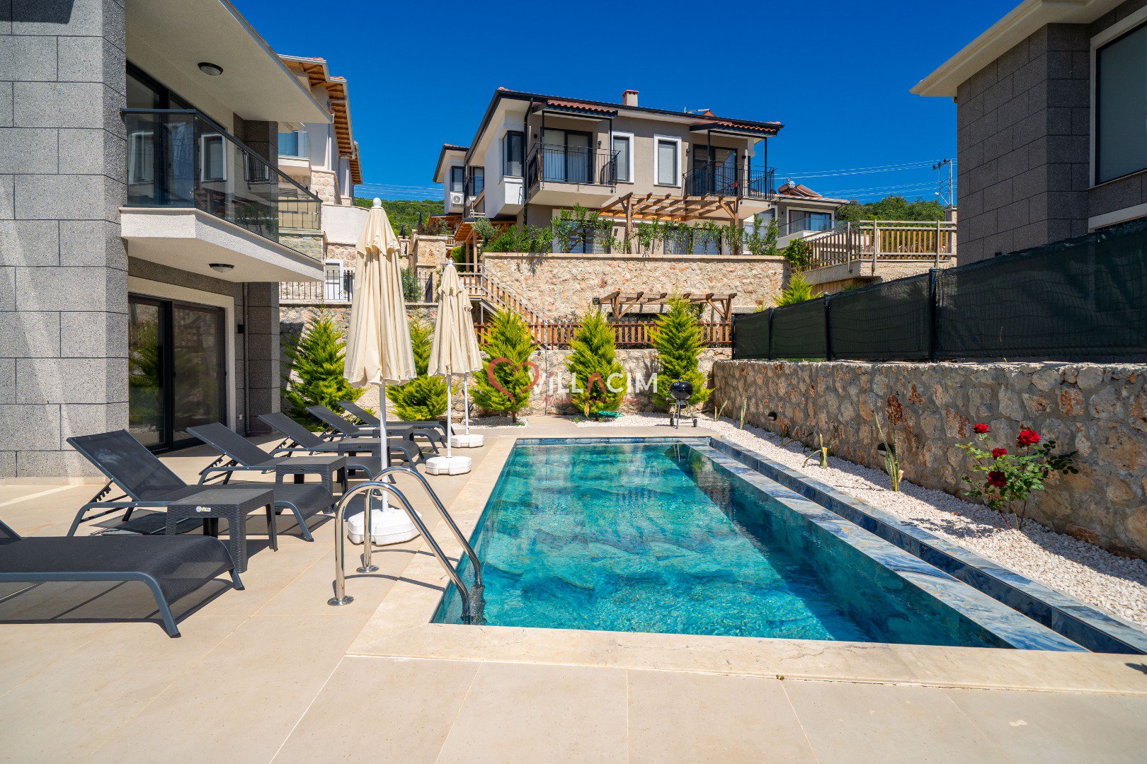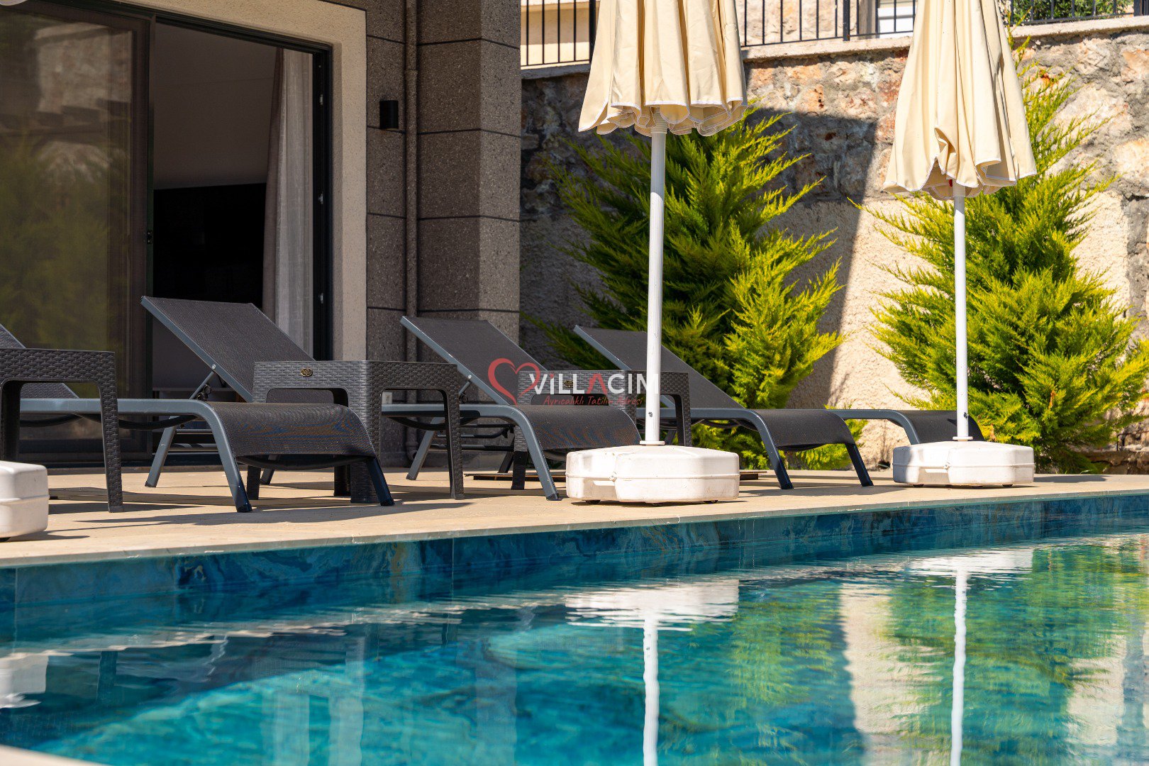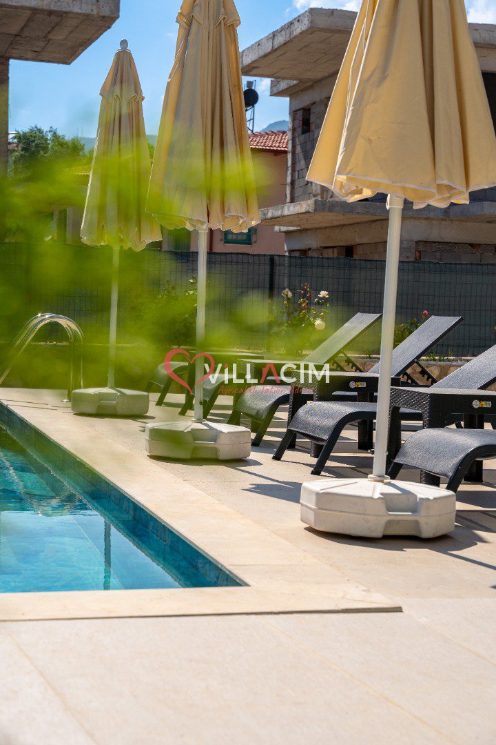 Geniş havuz terasında güneşin tadını çıkarabilir, özel yüzme havuzunda serinleyebilirsiniz. Villanın sunduğu mahremiyet seviyesi, özellikle muhafazakâr aileler veya sakin bir balayı geçirmek isteyen çiftler için ideal bir ortam sunar. Dışarıdan görünmeyecek şekilde planlanan havuz alanı, misafirlerin gönül rahatlığıyla dinlenmesine olanak tanır.