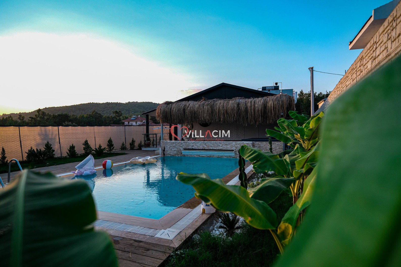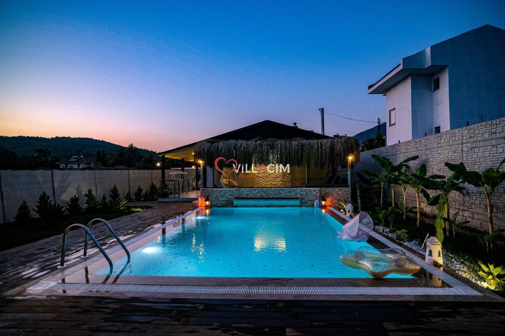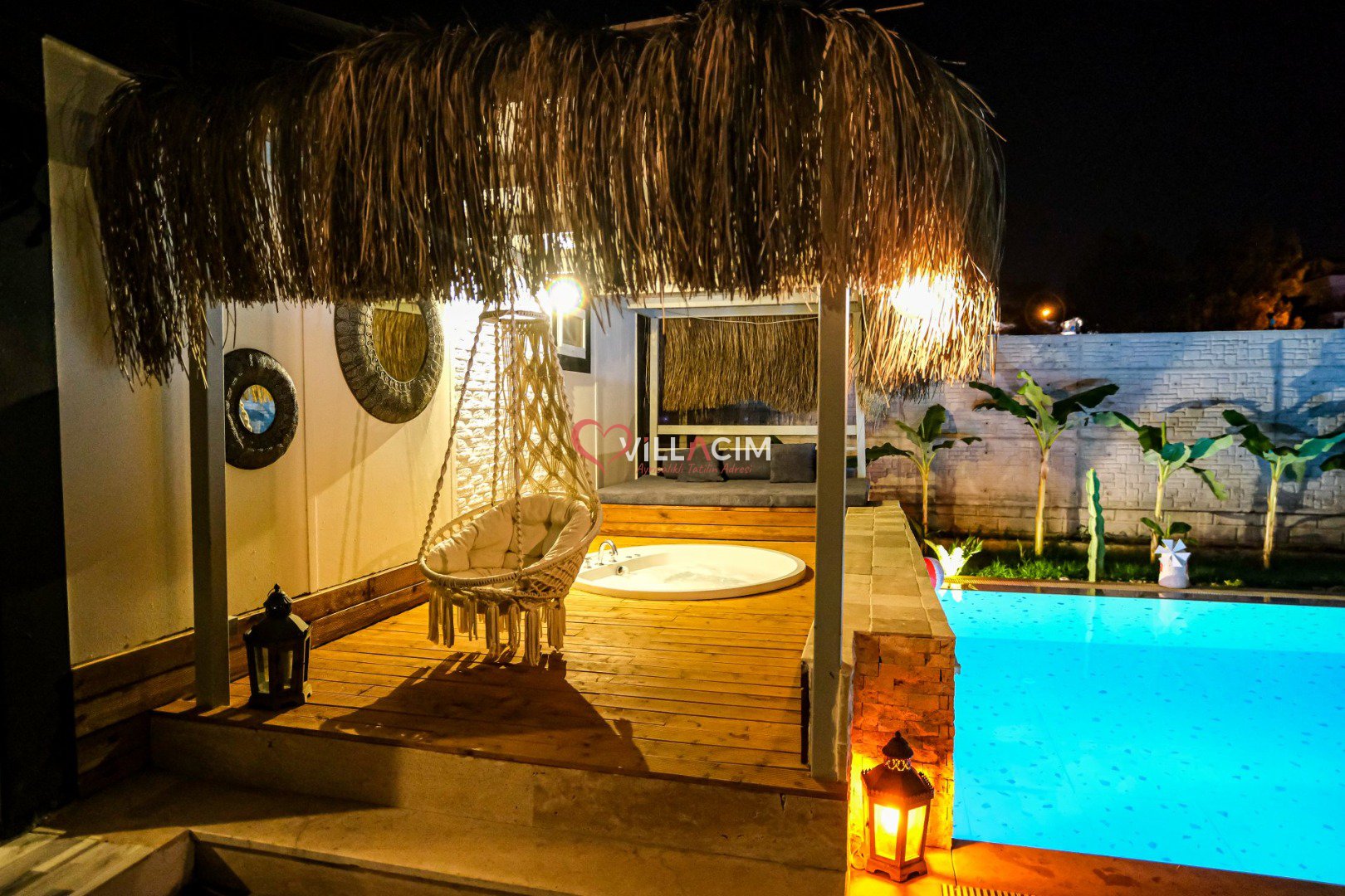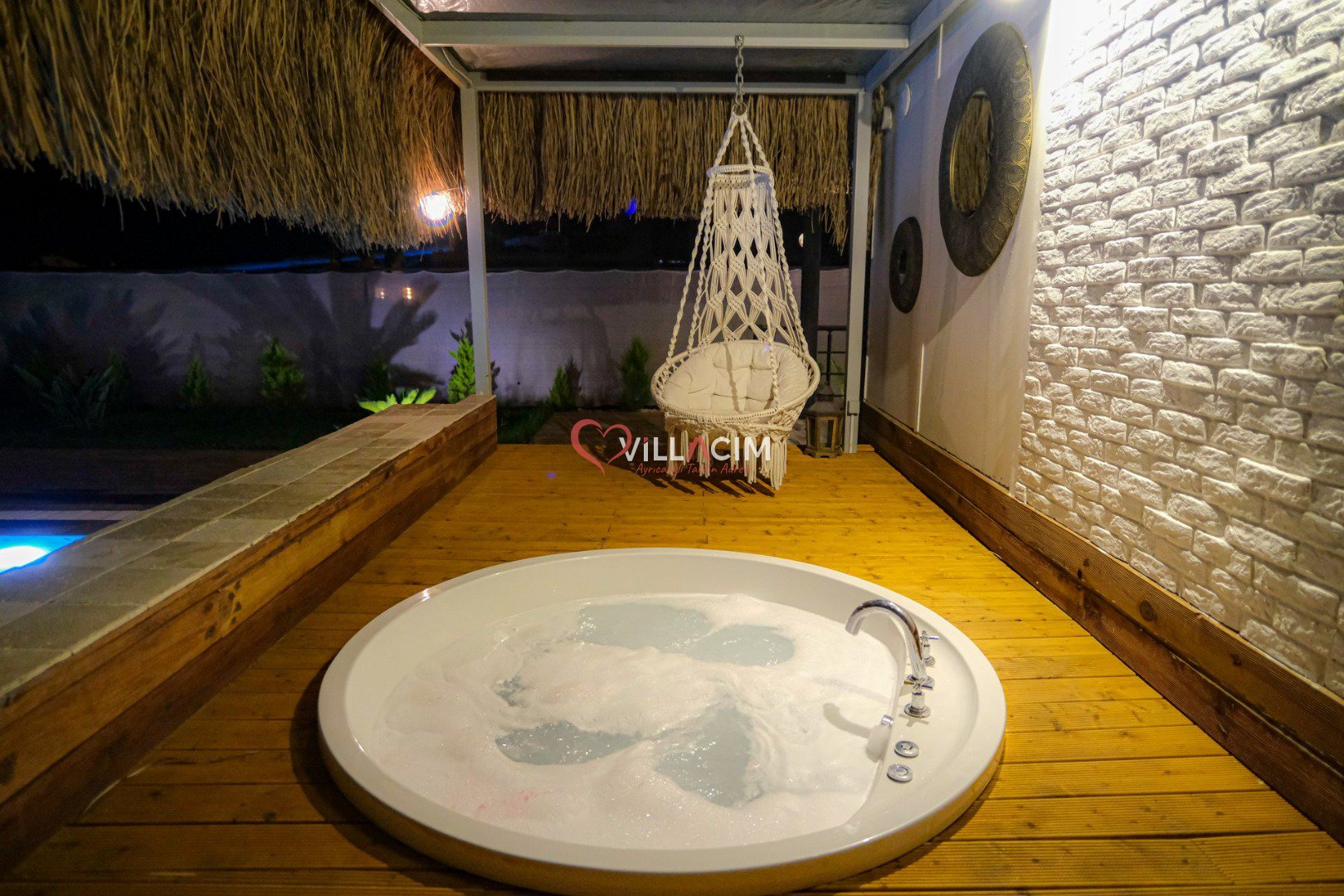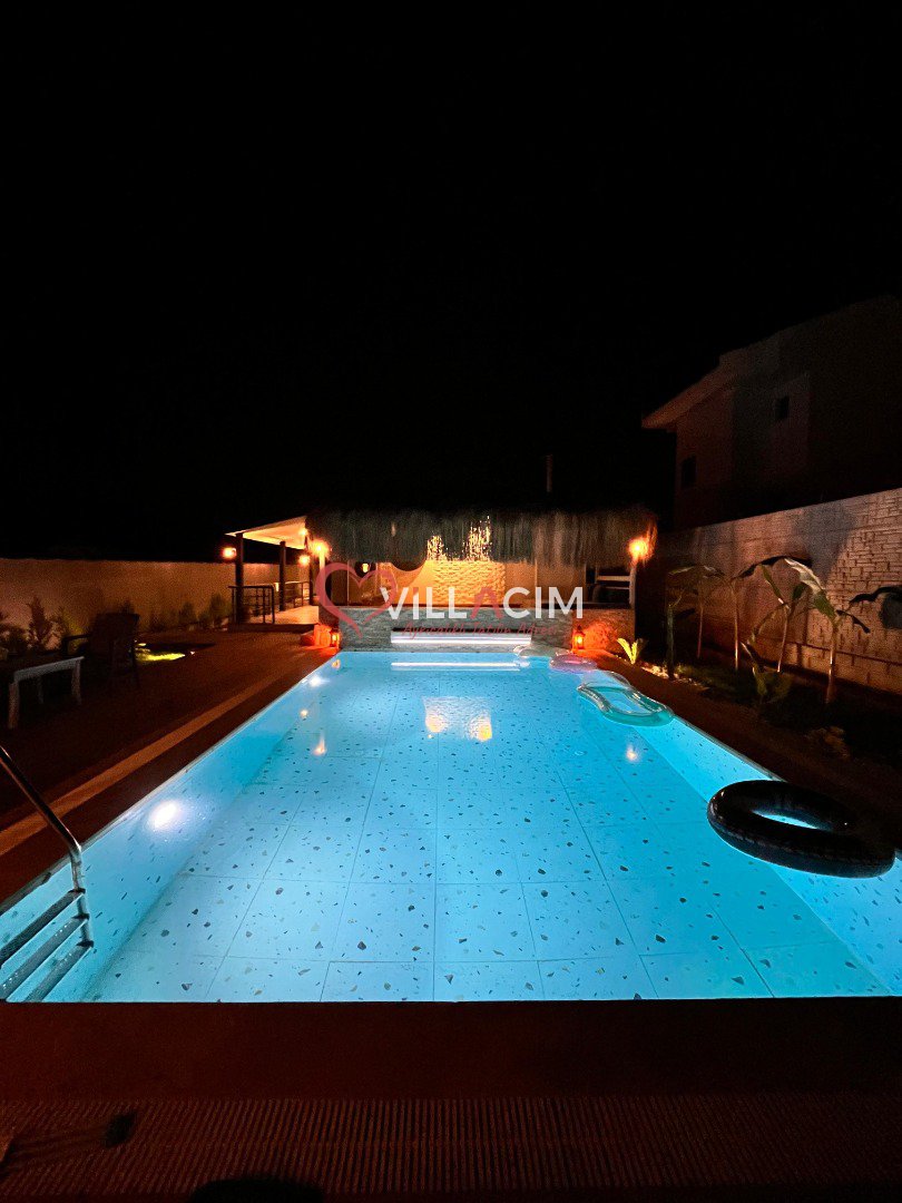 Villada bulunan özel yüzme havuzu ve dış mekan jakuzisi, tatilinizi daha keyifli ve lüks hale getirirken; geniş bahçe alanı ve peyzaj düzenlemesi doğayla iç içe huzurlu bir ortam sağlar.