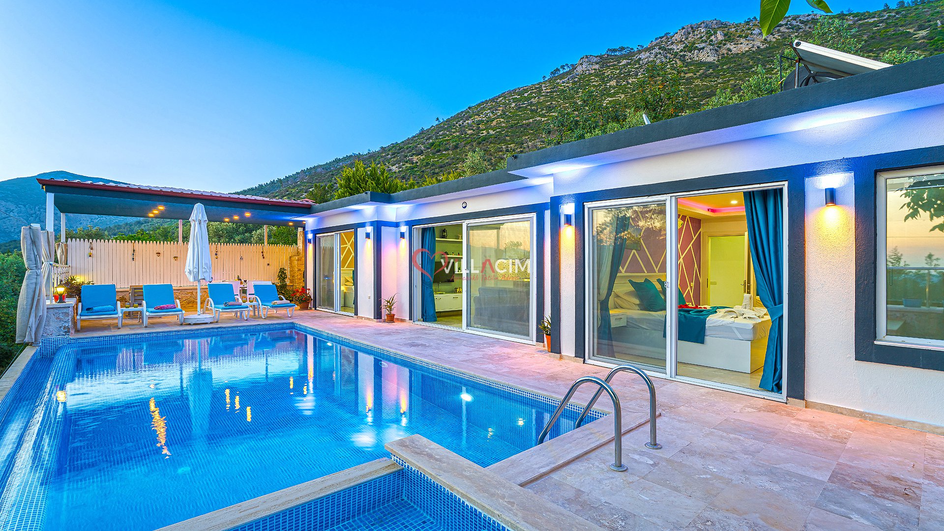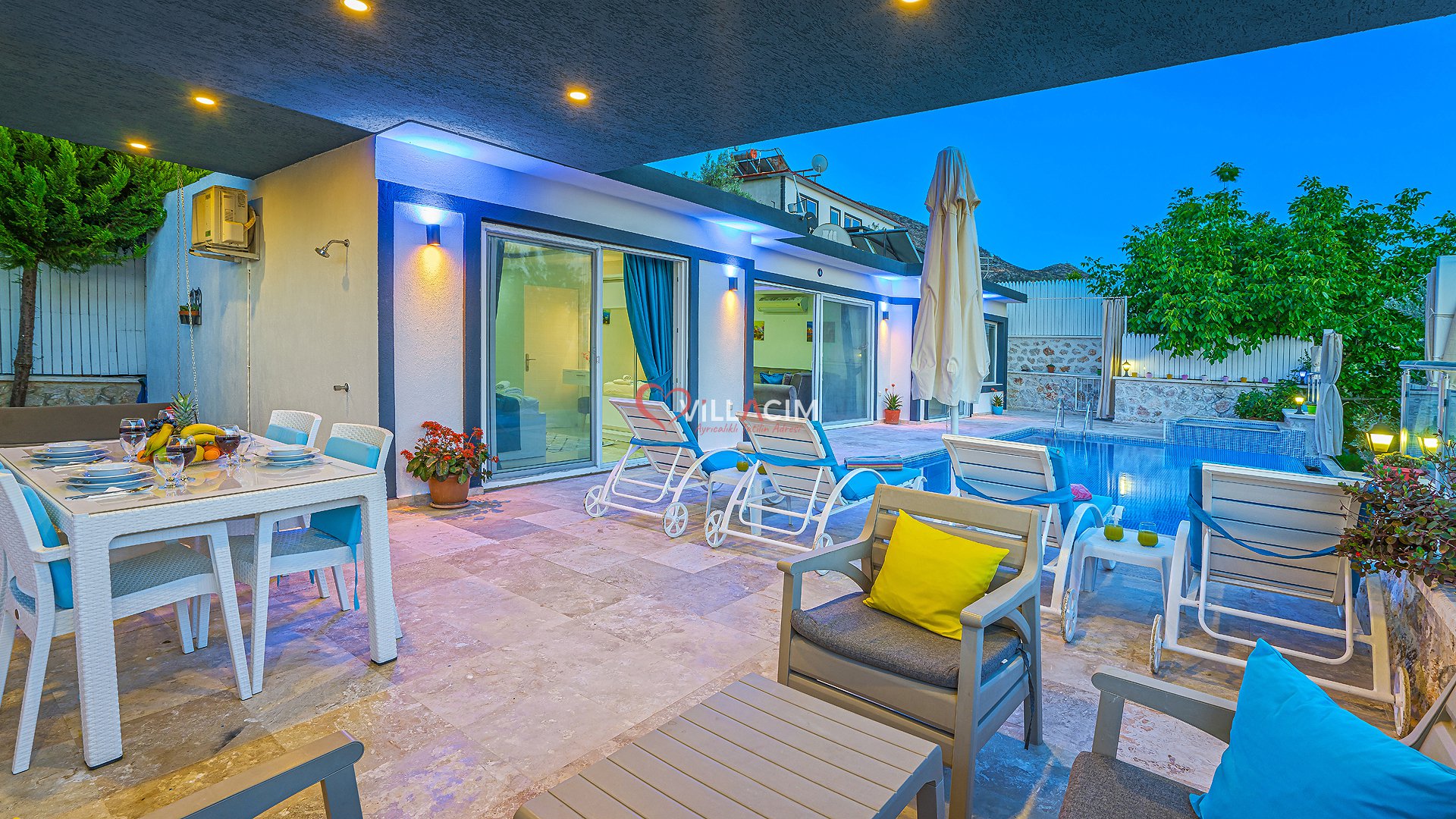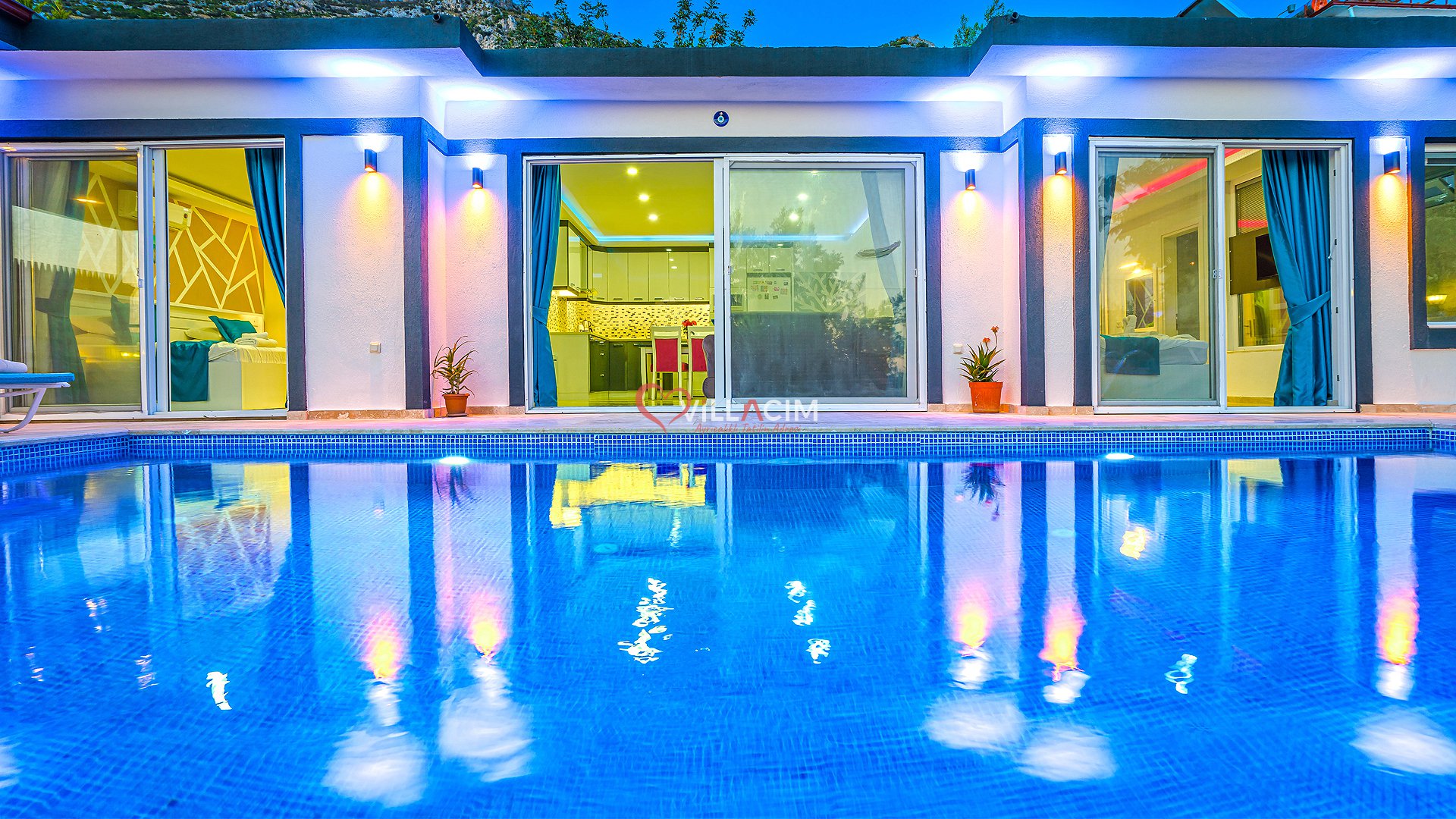 Antalya / Kalkan Üzümlü bölgesinde bulunan 4 kişi kapasiteli tatil villamızdır. Havuz alanı korunaklı olan villamızın kıs ayında havuz alanı kapatılı ısıtma sistemi acılmaktadır. içerisinde çift kişilik jakuzisi bulunmkatdır. Balayı çiftleri ve çekirdek aileler için uygundur.