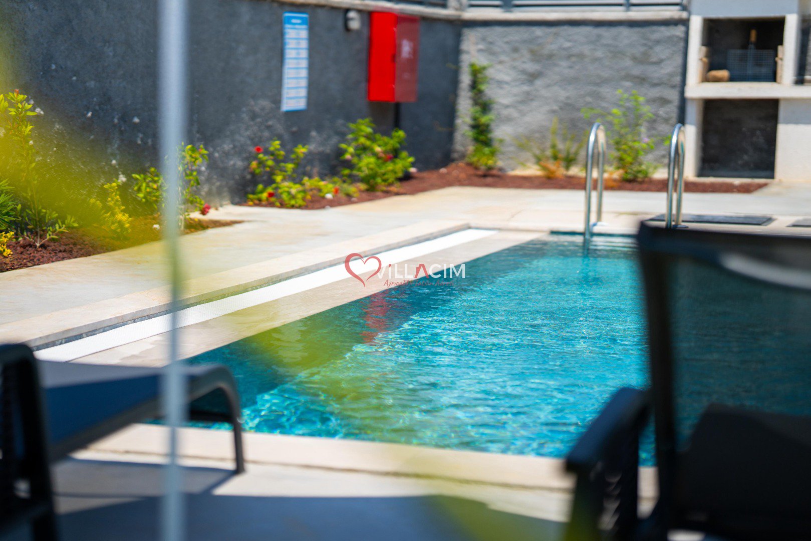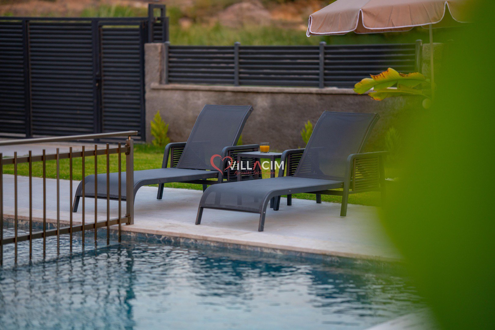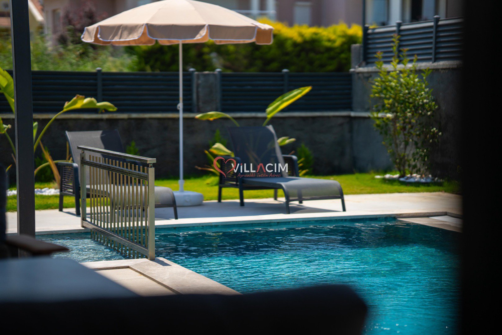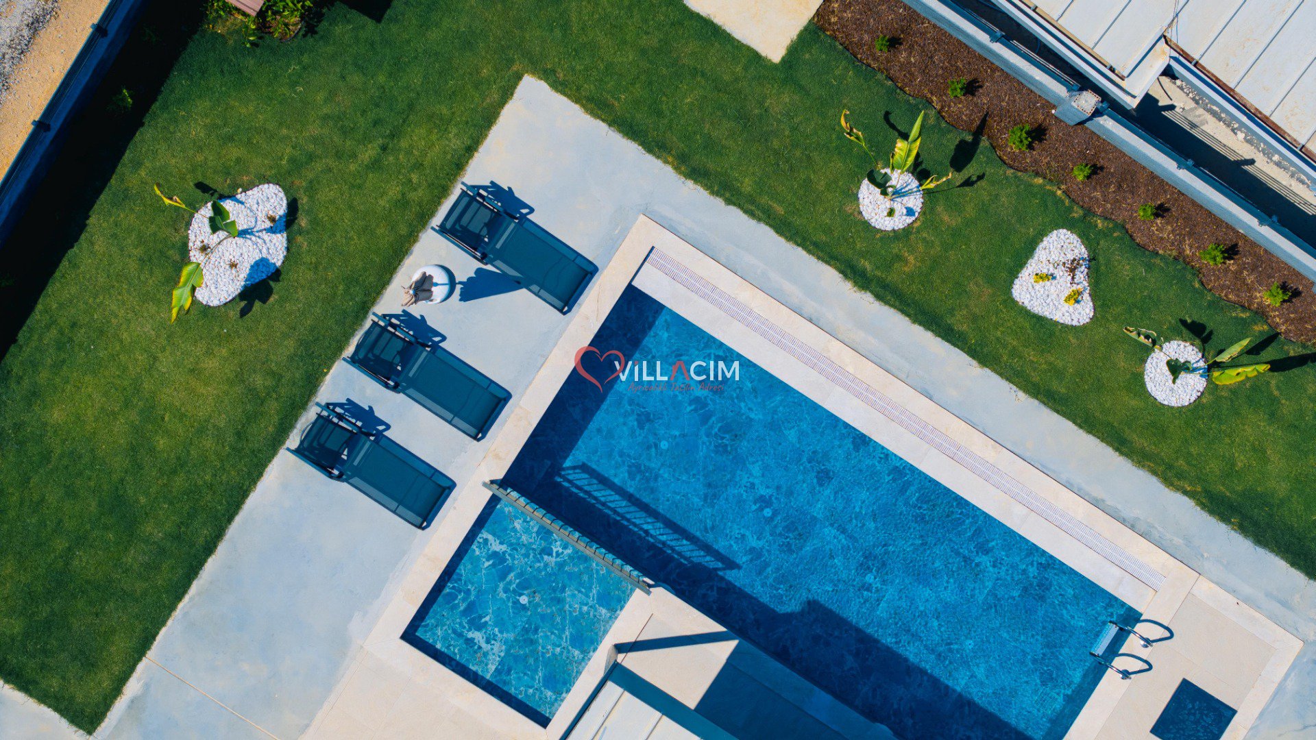 Havuz: Villanın özel yüzme havuzu ve çocuk havuzu, ailenizle güvenli ve eğlenceli zaman geçirmeniz için ideal. Geniş havuz terasında şezlong takımı, rahat bir oturma grubu ve barbekü alanı bulunuyor. Akşamları burada, sevdiklerinizle birlikte gün batımına karşı uzun sohbetler edebilirsiniz.